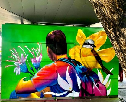 Finalmente, en la estación Refugio la artista ‘Violenta’ con su mural “Colibrís del barrio”, a través de una composición desde viñetas, armó un recorrido mostrando al colibrí, las flores, los árboles y la quebrada que pasa por el barrio, así como a la niñez que cuida la naturaleza.