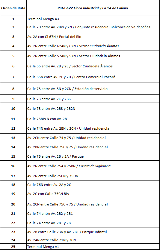 Debido al Plan de Manejo de Tránsito implementado por la construcción de la Troncal Oriental en la Calle 70N y, como resultado de las mesas de trabajo realizadas con la comunidad, desde la fecha se modifica el recorrido de la ruta A22 Terminal Menga – Brisas de los Álamos.