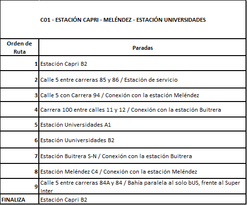 Finalmente, se reactiva el servicio de la ruta C01. La cual funciona de lunes a sábados de 5:00 a.m. a 10:00 p.m. y domingos y festivos de 6:00 a.m. 9:00 p.m.
