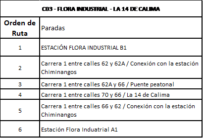 Paradas ruta C03 Flora Industrial – La 14 de Calima