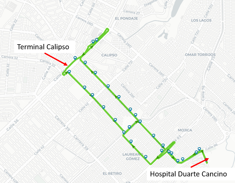 Variante larga Esta variante corresponde al recorrido actual de la ruta, más el horario de atención de acuerdo al servicio que presta el hospital Isaías Duarte Cancino. De esta manera, la ruta operará de lunes a sábado de 5:45 de la mañana hasta las 7:30 de la noche. Mientras que, los domingos y festivos su servicio será de 6:00 de la mañana hasta las 7:30 de la noche.