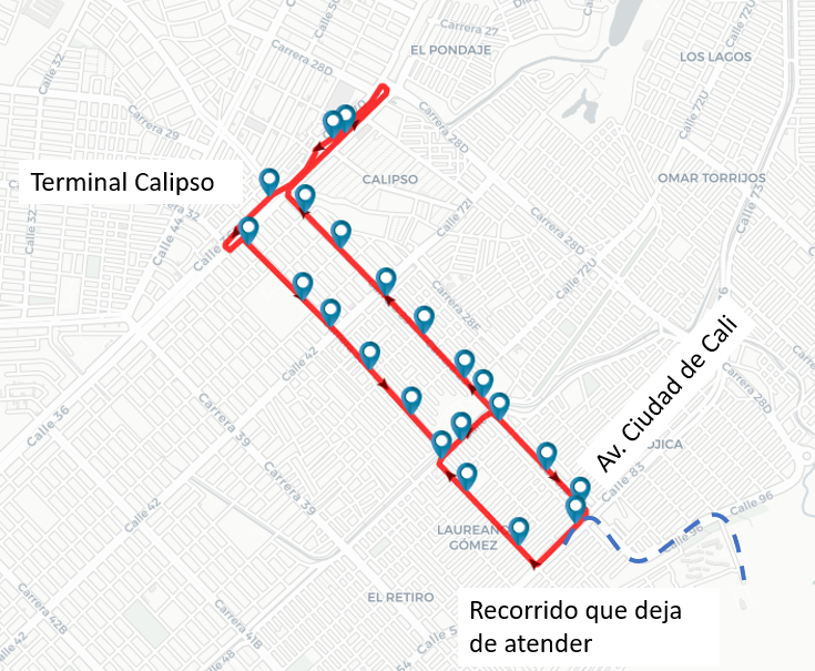 Esta variante tiene un recorte en el recorrido de la ruta, dejando de atender en algunos horarios el hospital Duarte Cancino dado que, la afluencia de usuarios al centro médico en dichos horarios es casi nula. En ese sentido, la ruta con esta variante en horas de la mañana funcionará de 5:00 a.m. a 5:45 a.m. y de 7:50 p.m. a 11:00 de la noche. Esta ruta iniciará en la Terminal Calipso hasta la parada ubicada en la Avenida Ciudad de Cali con 29 en Comuneros I.
